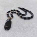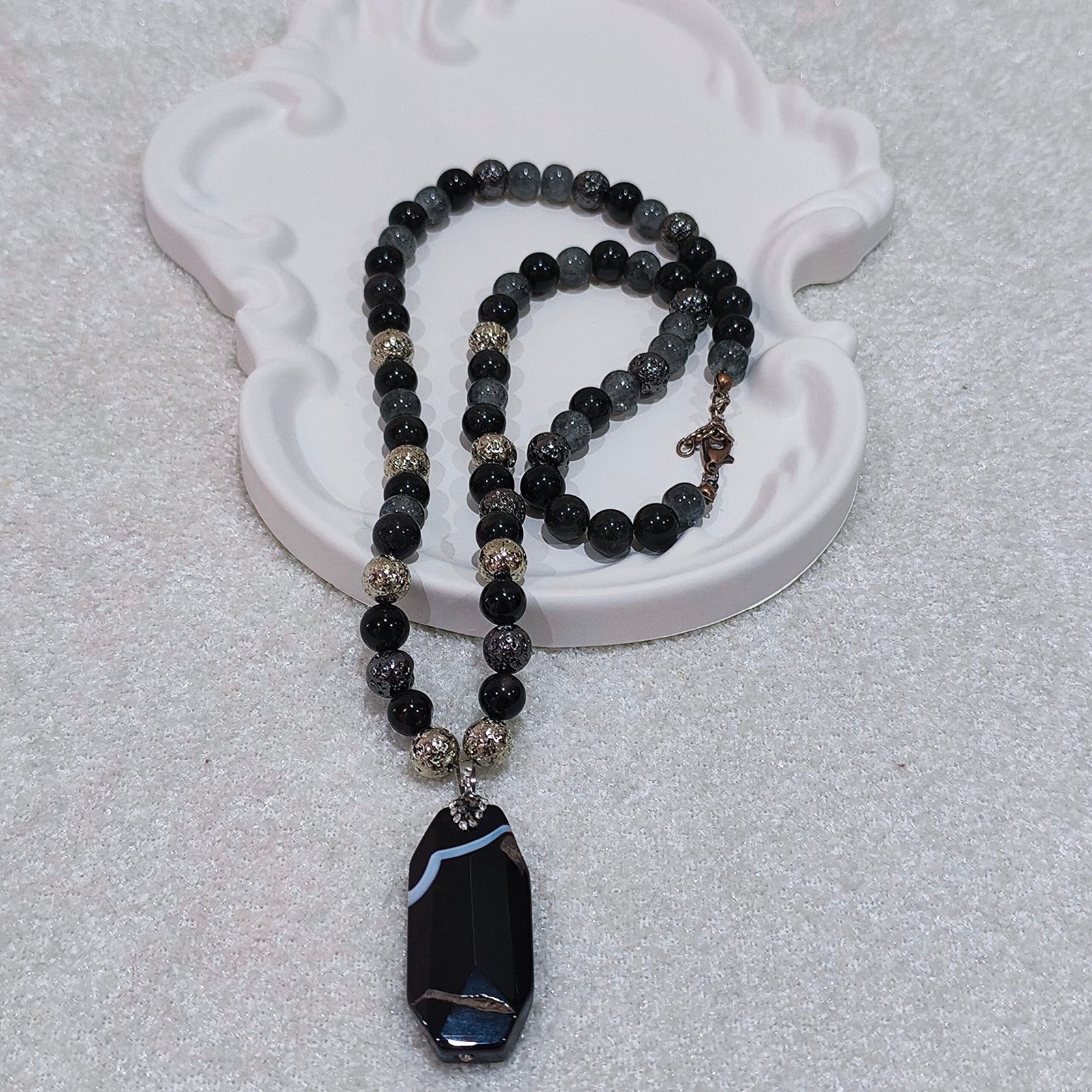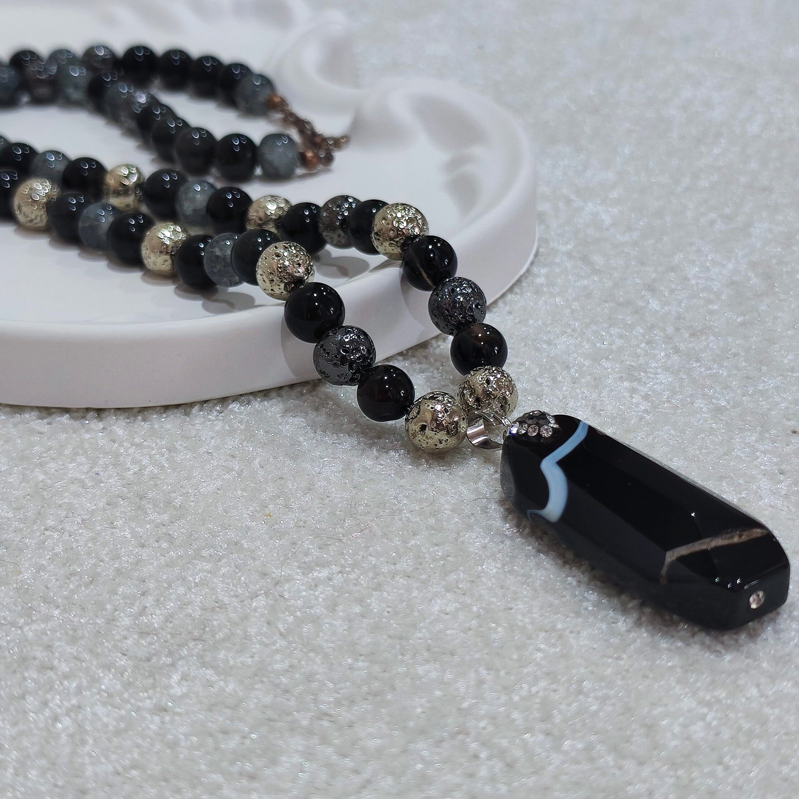 This handmade necklace, elegantly combined with Black Onyx and Labradorite stones, is the perfect choice for those seeking both aesthetics and healing. Gold-tone details and a black crystal pendant complete the necklace’s elegance. With its eye-catching design and power to restore spiritual balance, this necklace will elevate your style and energy.