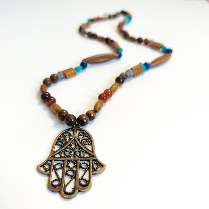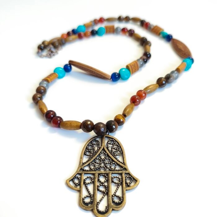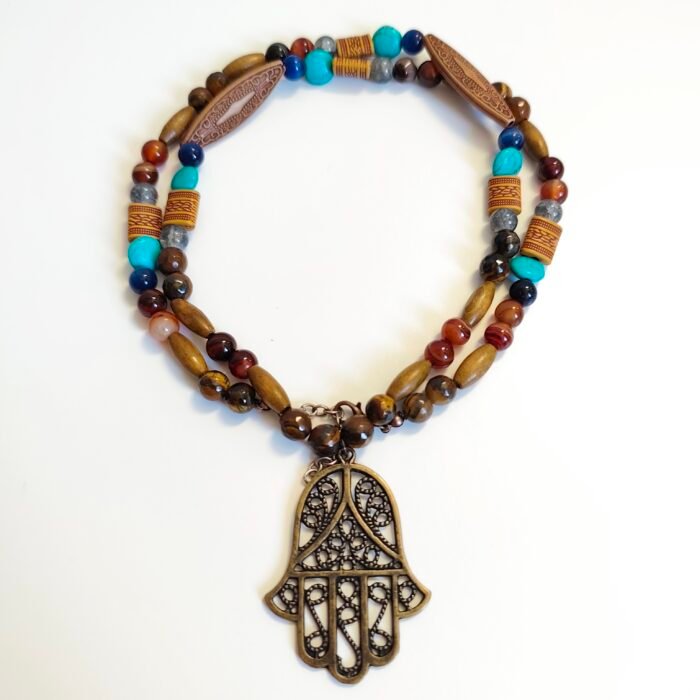 This special necklace, designed with the Hamsa hand symbol, embodies the energy of natural stones and wooden details. Enriched with turquoise, amber, and natural stone beads, the design offers both elegance and spiritual strength with its protective energy. The wooden details and the Hamsa pendant add an ethnic touch to the necklace, creating a look that is both modern and mystical.