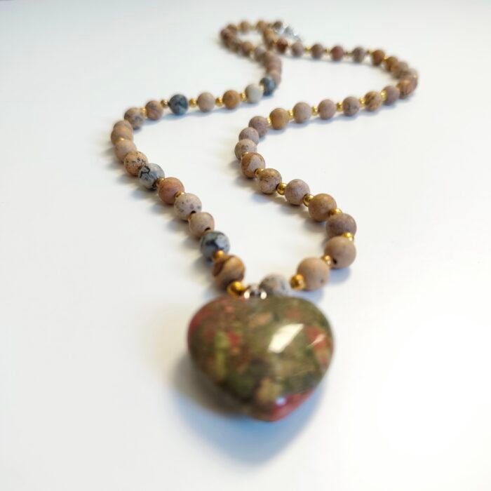 Heart Pendant: The large Jasper heart pendant on the necklace symbolizes emotional balance and the energy of love.
