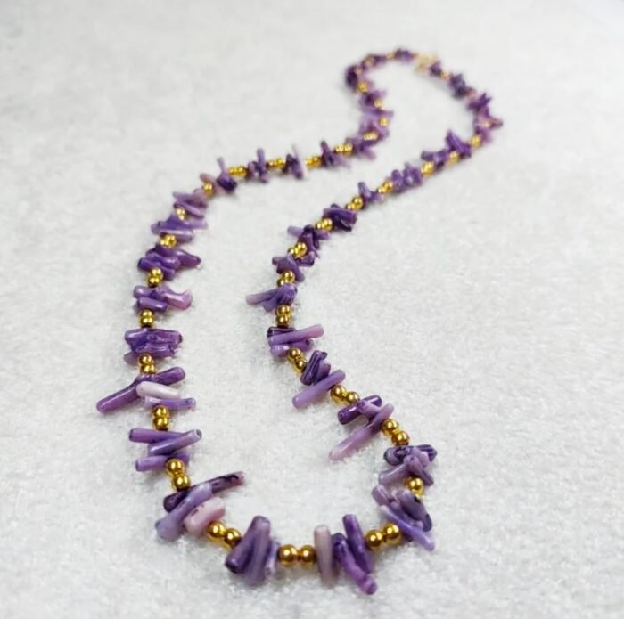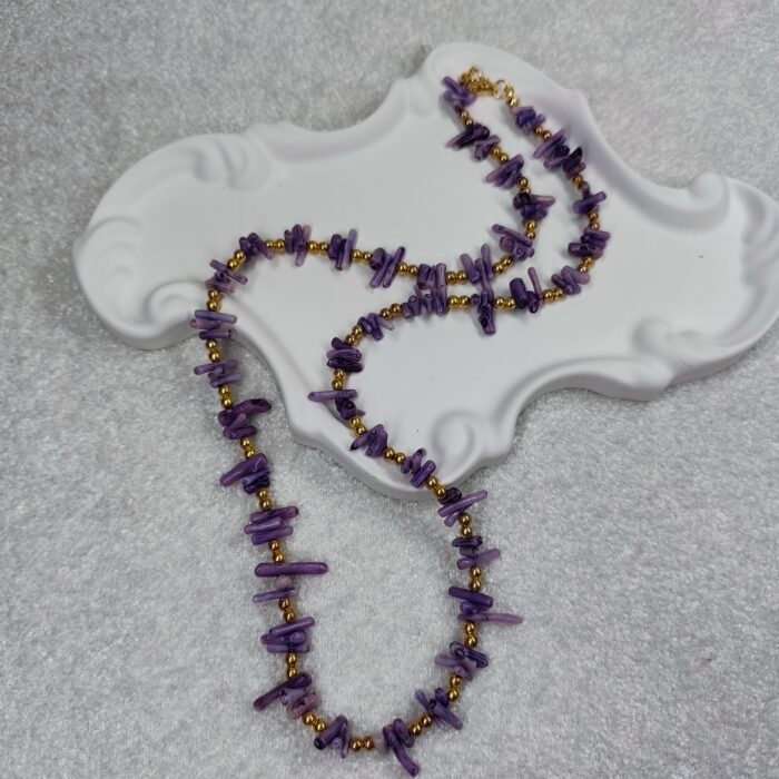 This handmade necklace, featuring the elegant shape of purple chalcedony and enriched with gold-colored beads, is a piece of jewelry that will complement your elegance and enhance your spiritual balance. Chalcedony helps maintain emotional balance, while purple-toned stones provide spiritual peace. The gold details in the necklace design are the perfect complement for lovers of bohemian style.