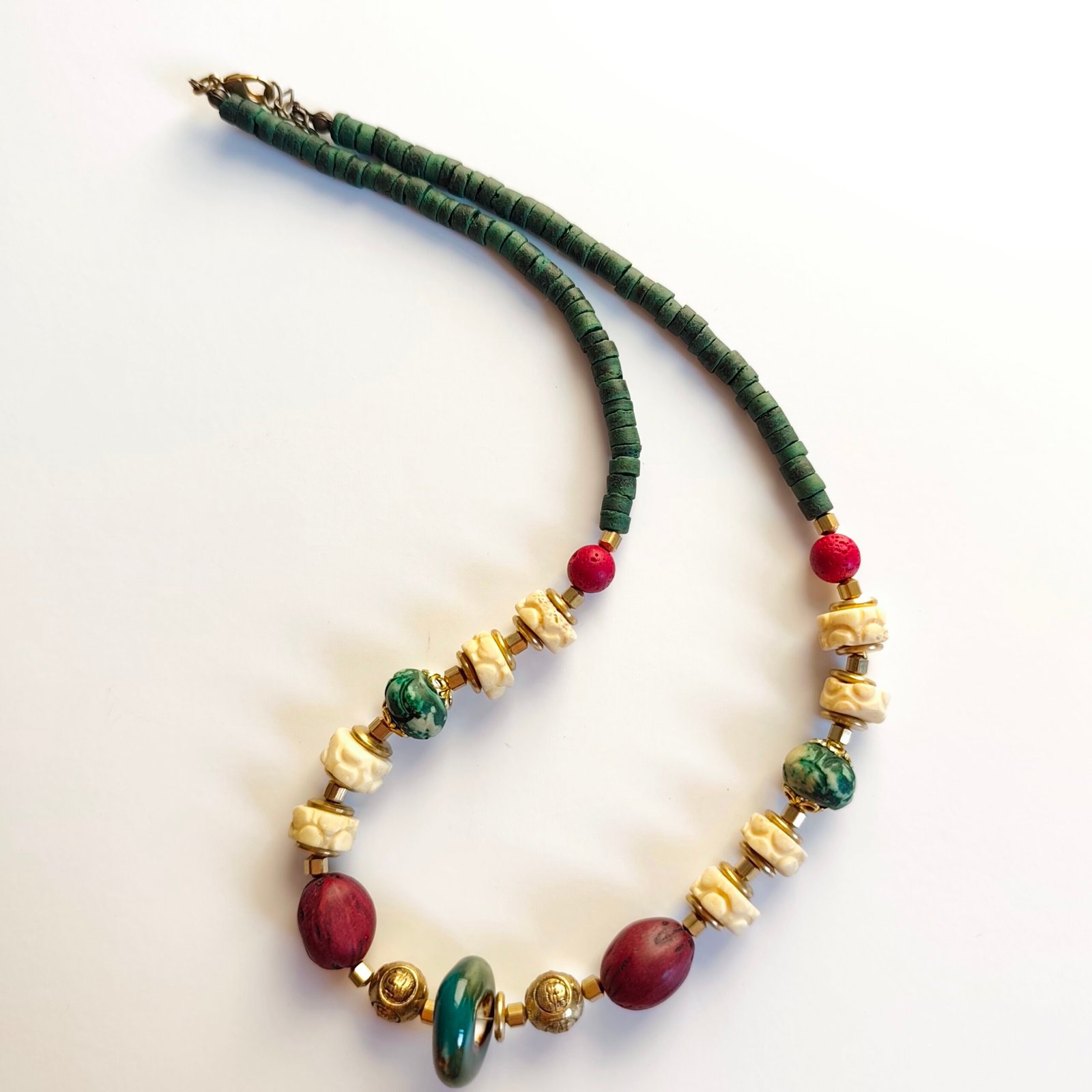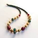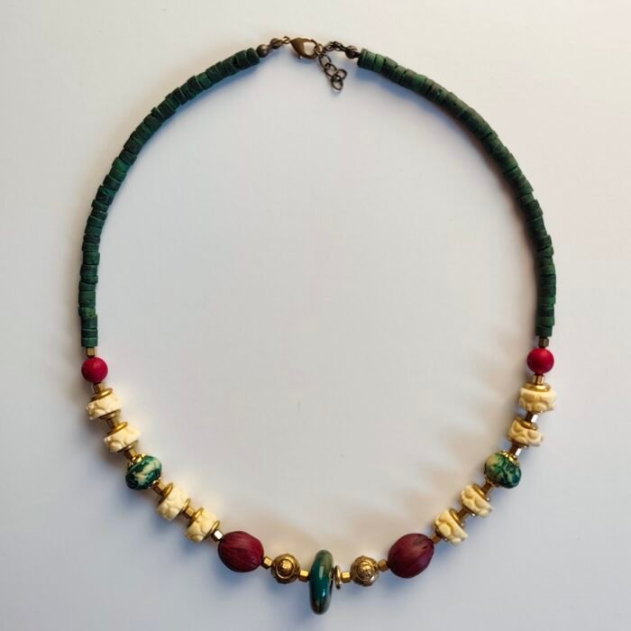 Bohemian Style Handmade Green and Red Beaded Necklace with Gold Metal Details