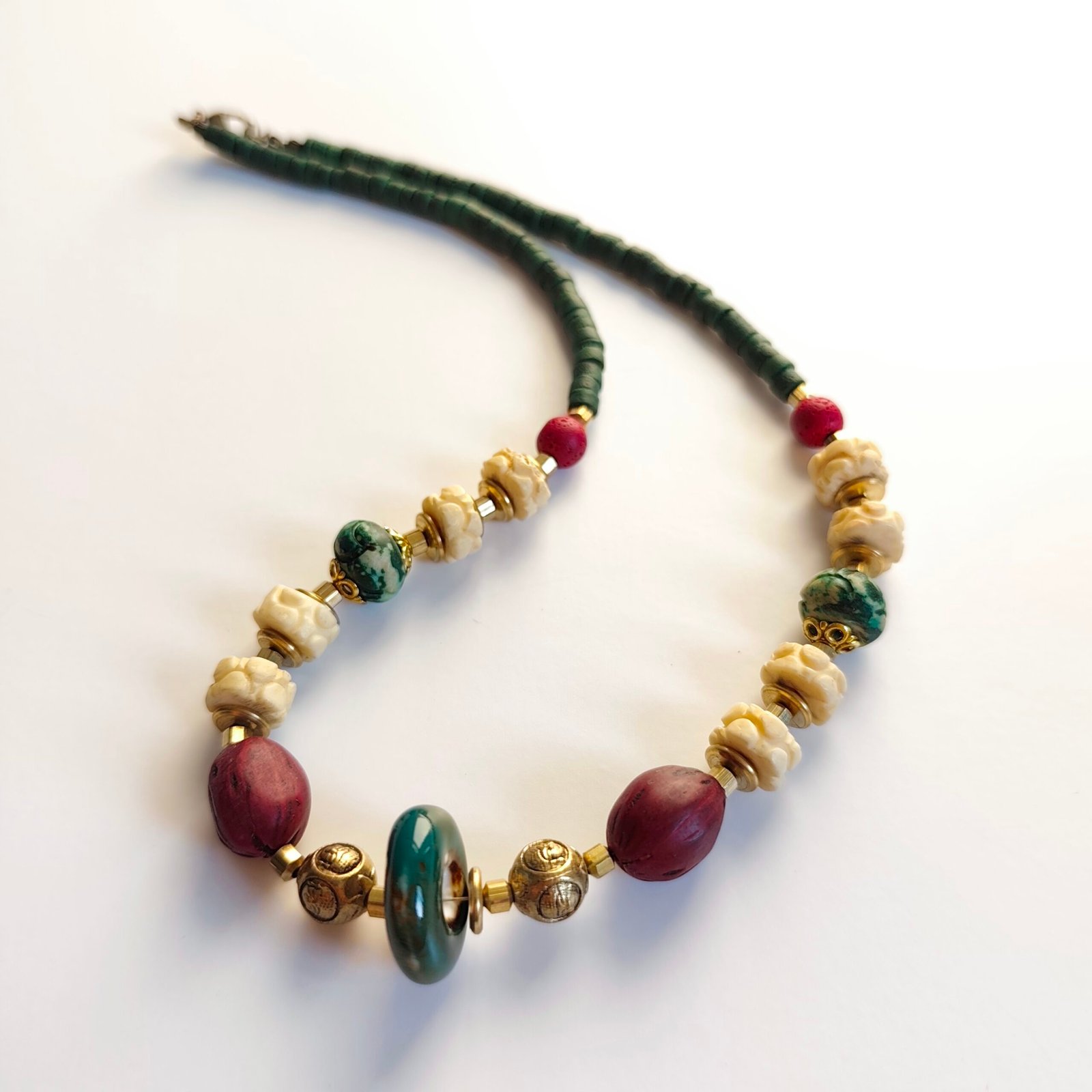 Green and Red Beads: The necklace is designed with natural stones and beads in green and red, adding a vibrant and energetic atmosphere.