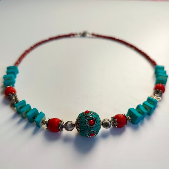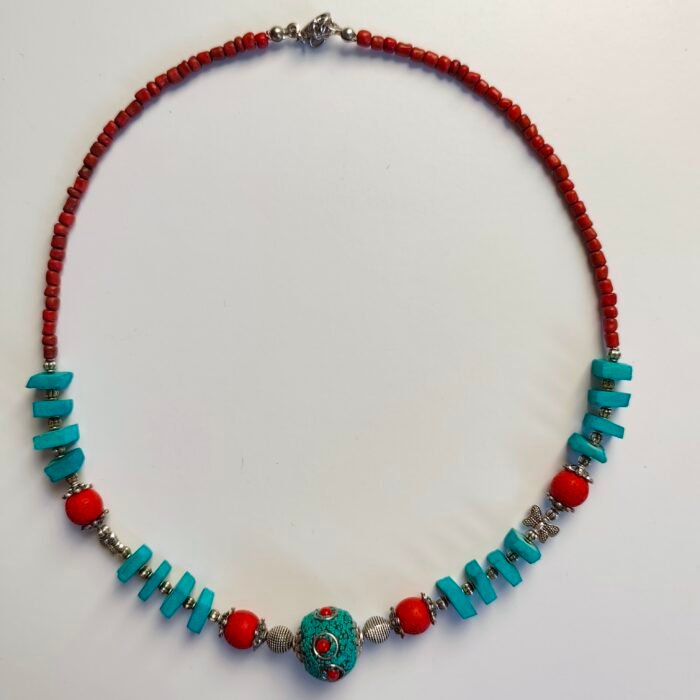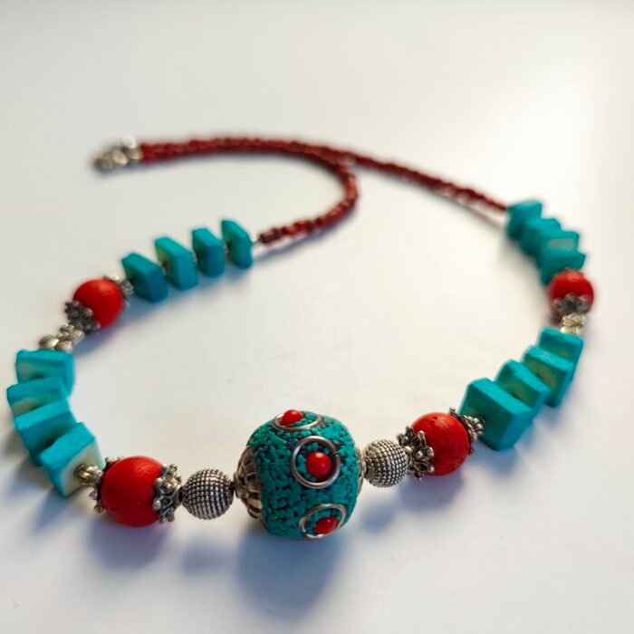 This chic and energetic bohemian-style necklace is designed with beads in vibrant blue and red tones, complemented by silver details. The harmony of colors and the silver metal pieces add an elegant touch to this necklace.