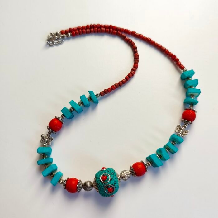 Blue and Red Beads: The necklace is enriched with blue stones and red beads. These vibrant colors create an energetic look and reflect the joy of bohemian style.