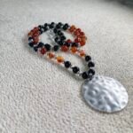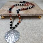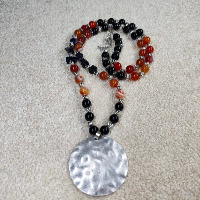This handmade necklace, designed with an elegant combination of Black Onyx, Amber, and Lapis Lazuli, stands out with both its elegance and healing properties. The pendant, finished with silver details, adds a modern touch to the design.