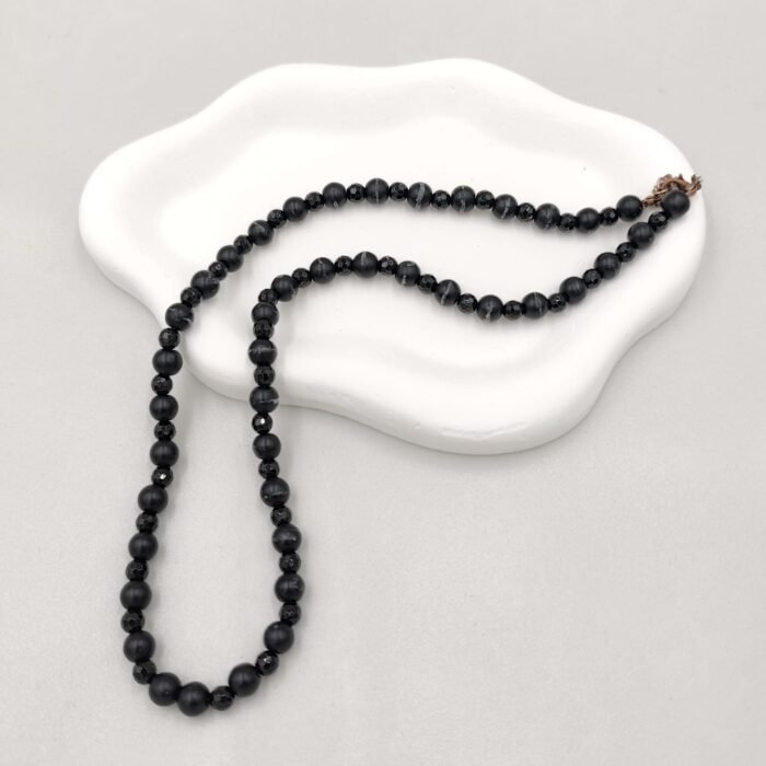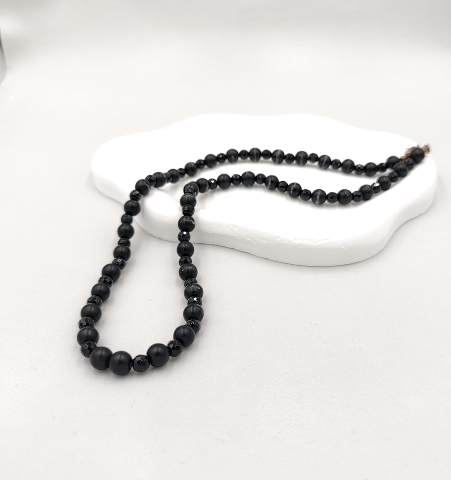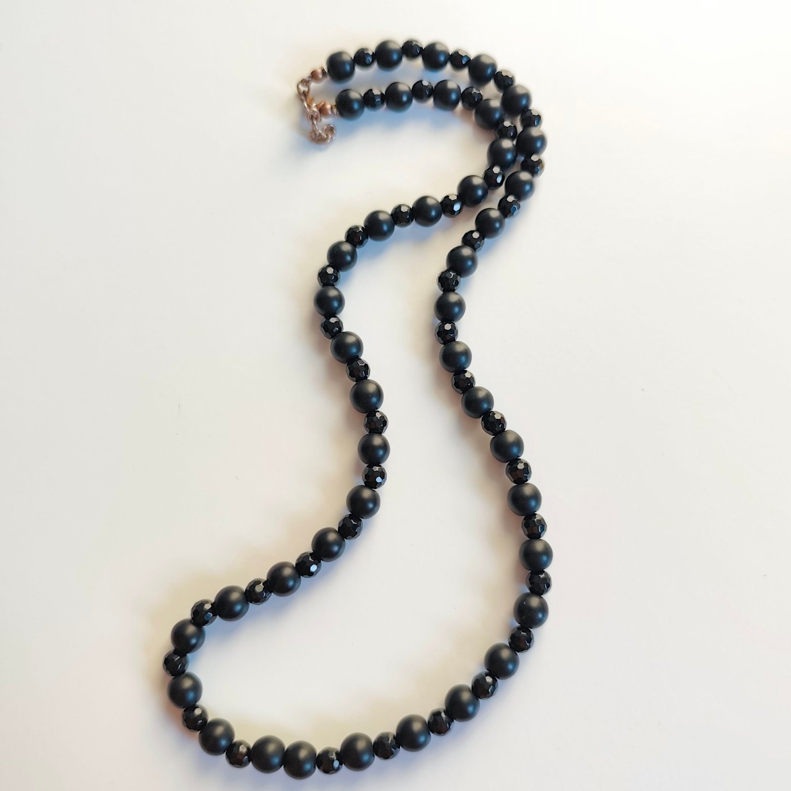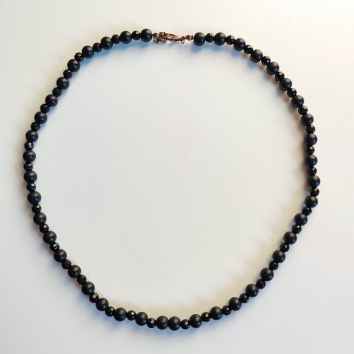 This chic and elegant onyx-hematite necklace is a modern piece of jewelry that will complement any style. Designed with the matte black hues of onyx and the shiny black metallic reflection of hematite, this necklace is an ideal accessory for both everyday wear and special occasions, crafted with stones known for their energy-balancing and mood-enhancing properties. The calming effect of onyx and the strength and balance of hematite make this necklace not only an aesthetically pleasing but also a useful piece of jewelry.
