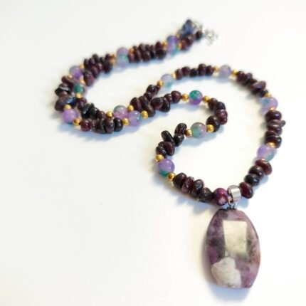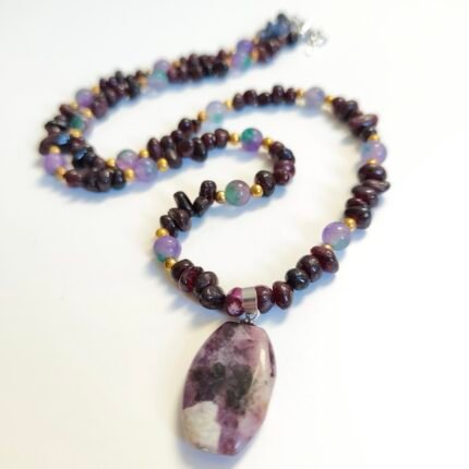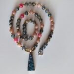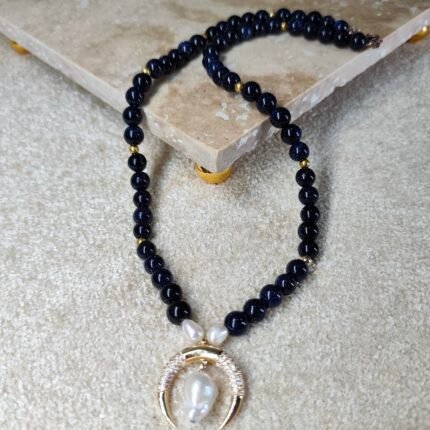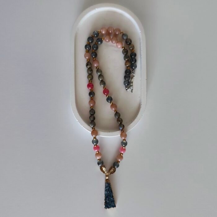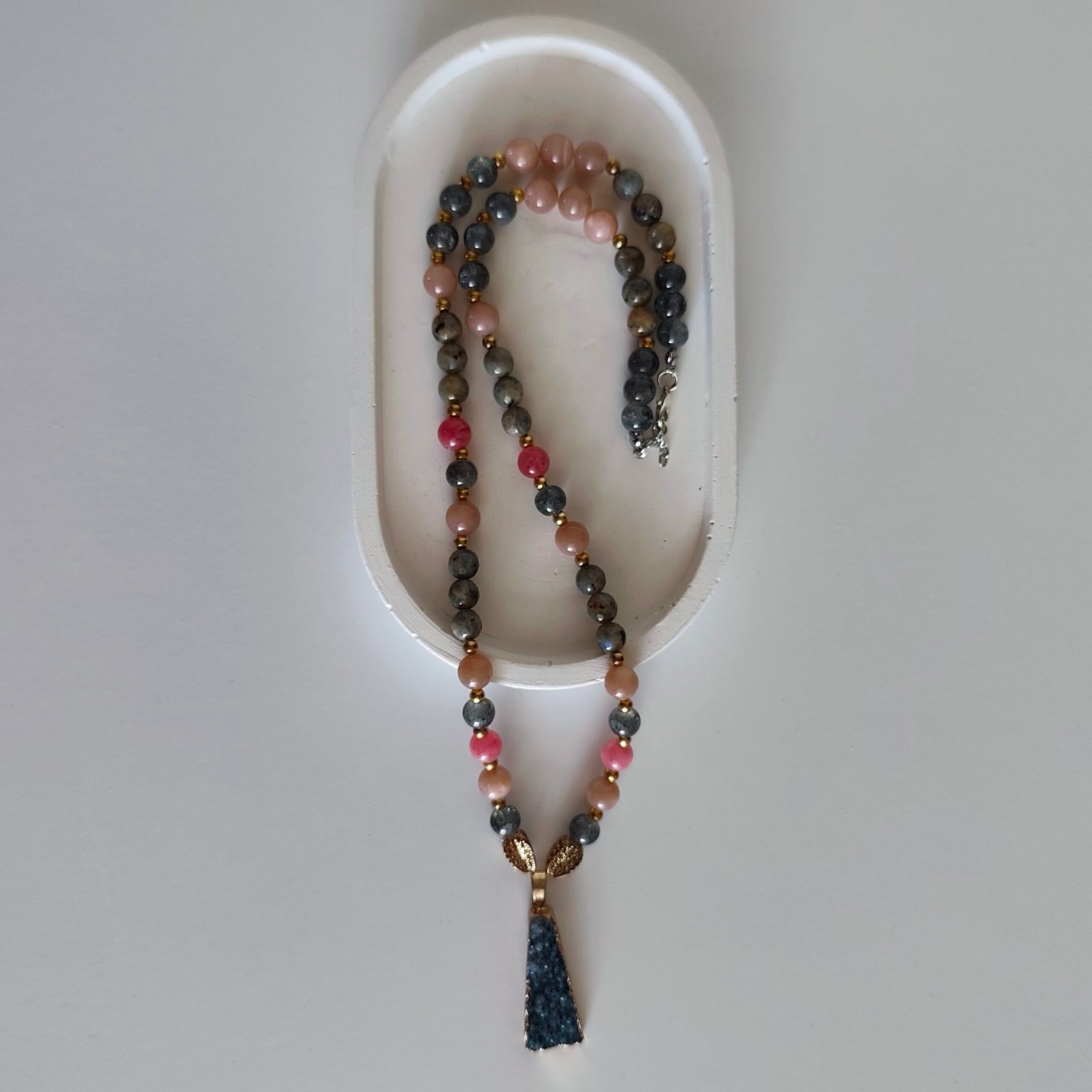 Bu el yapımı kolye, Sodalit, Rodonit ve Labradorit’in güzelliğini bir araya getiriyor. Sodalit zihinsel berraklığı ve odaklanmayı desteklerken, Rodonit duygusal dengeyi destekler. Labradorit kişisel gücü artırır ve ruhsal gelişime katkıda bulunur. Altın tonlarındaki detaylar ve şık doğal taş kolye ucu, kolyeye zarif bir dokunuş katıyor.