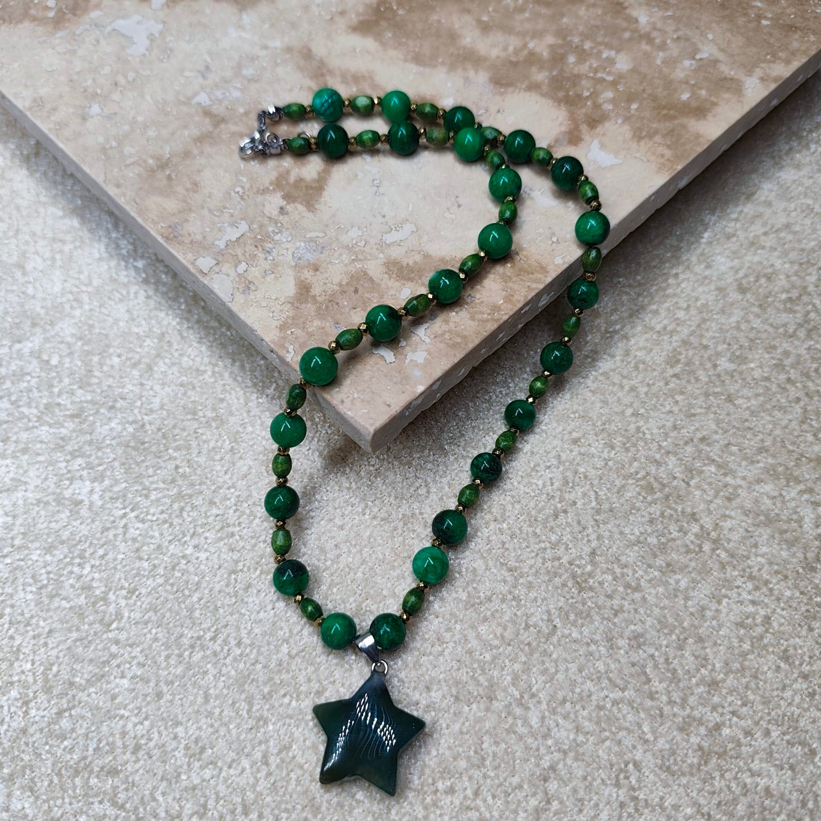 Designed with the energy of natural stones, this elegant necklace stands out with its elegance and healing properties. The harmony of Green Malachite and Aventurine is both eye-catching and helps maintain energy balance.