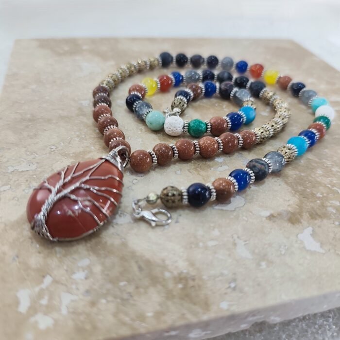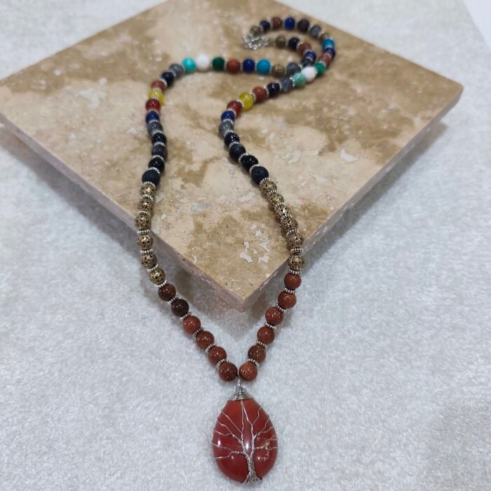 This handmade necklace, designed with the Tree of Life symbol, is combined with natural stones that carry the energy of nature and enriched with gold details. The Tree of Life symbol symbolizes the power of life and our roots, while the colorful stones used enhance both elegance and energy. The gold details in the design give the necklace a sophisticated look.