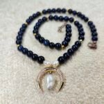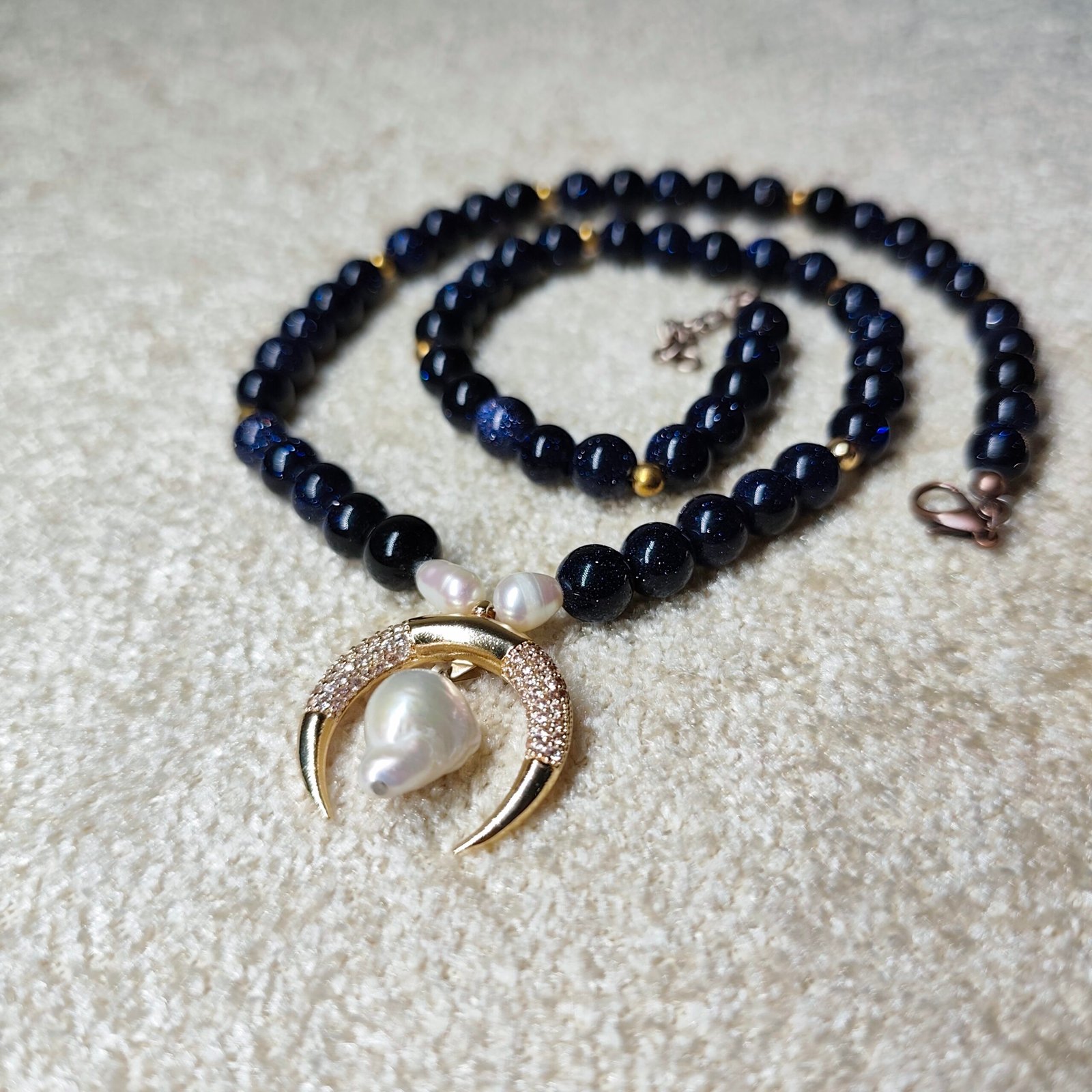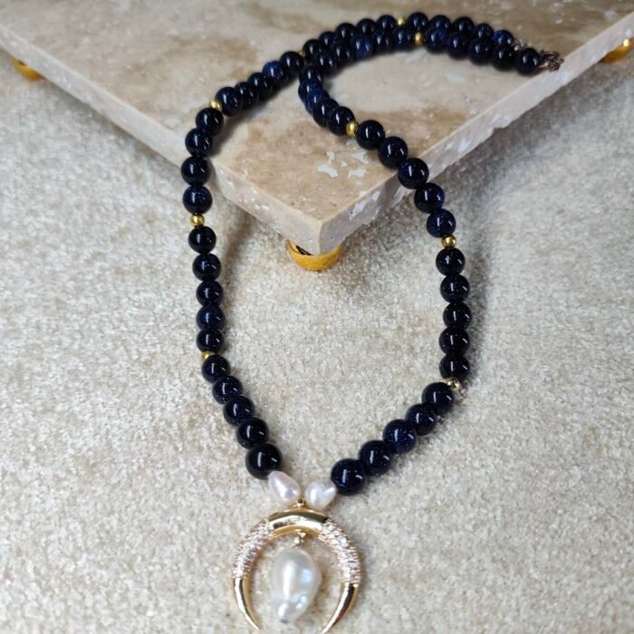 The dark blue sandstone used in this unique necklace, with its deep color and sparkle reminiscent of the night sky, captures attention both aesthetically and spiritually. Sandstone is a stone believed to dispel negative energy and enhance focus.